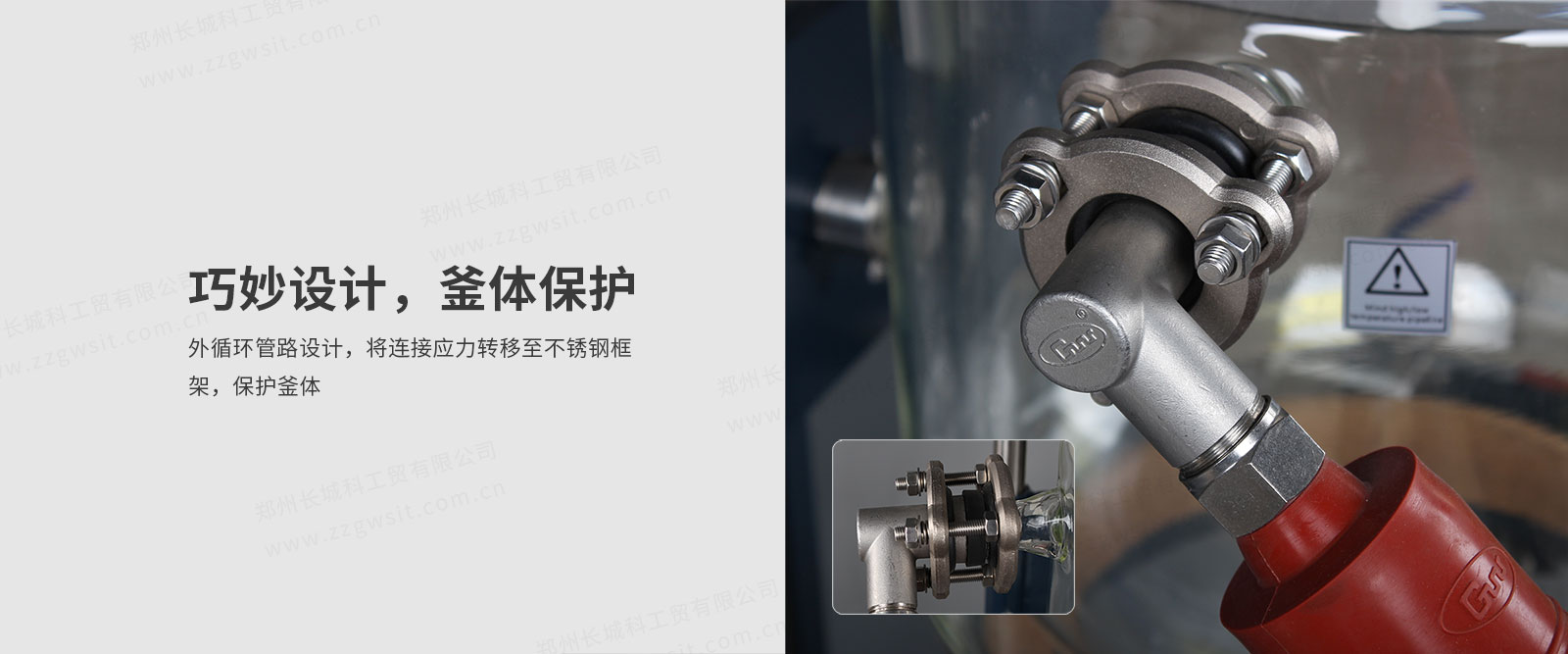 ● 夾套進、出液口連接不銹鋼保溫軟管,減少進出液口應(yīng)力。